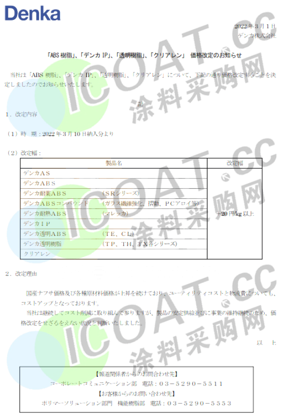 日本Denka株式會社:自3月10日起,將提高ABS樹脂、PC/ABS合金、DenkaIP、透明樹脂等產(chǎn)品的售價,上漲20日元/kg(約合人民幣1093元/噸)以上。