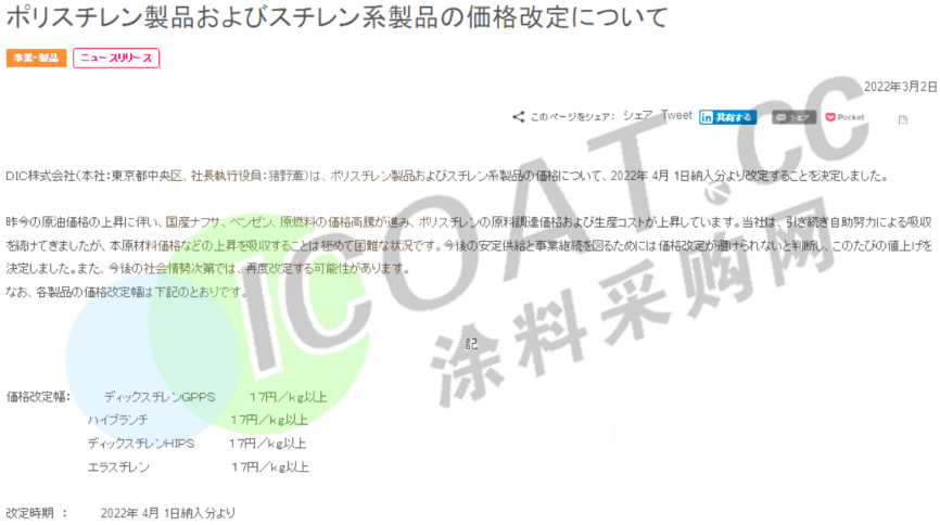 DIC株式會社官網(wǎng):4月1日起,GPPS、HIPS、苯乙烯等產(chǎn)品將上調(diào)17日元/kg(約928元/噸)以上。