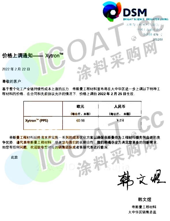 帝斯曼工程塑料:大中華區(qū)進一步上調(diào)Xytron™(PPS)的價格,上漲7400元/噸(不含稅)。