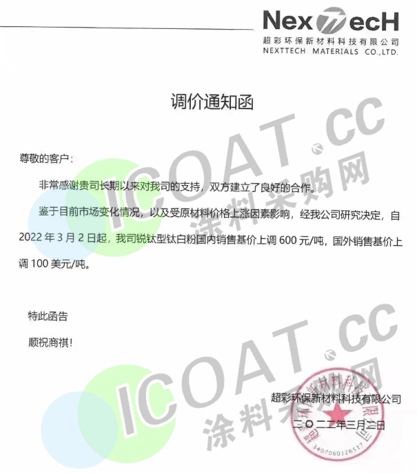 日本石原ISK:稱自4月1日起,TIPAQUE™系列鈦白粉價格上漲300美元/噸(約合1893元/噸)。