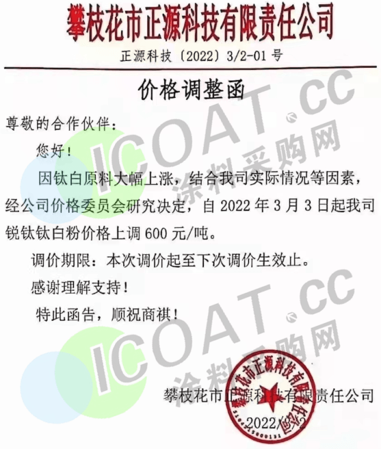 攀枝花市正源科技:3月3日起,銳鈦鈦白粉價格上調(diào)600元/噸。