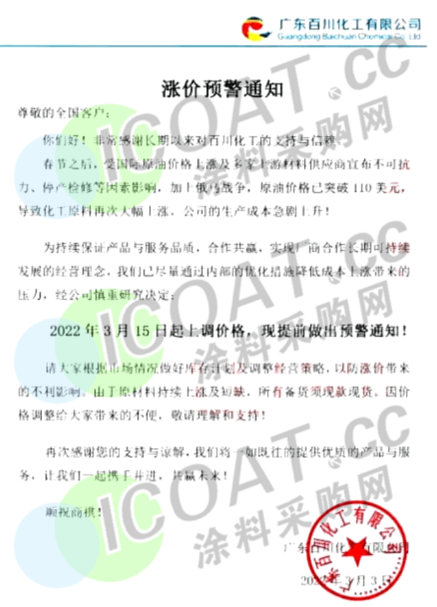 百川化工:2022年3月15日起上調(diào)價格。