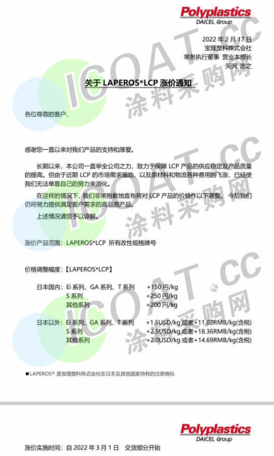日本寶理塑料:LAPEROS®系列的所有LCP(液晶聚合物)產(chǎn)品價格上調(diào),最高上漲15817元/噸!Ei,GA,T級產(chǎn)品上調(diào)1.5美金/kg;S級產(chǎn)品上調(diào)2.5美金/kg;其他等級產(chǎn)品上調(diào)2美金/kg。