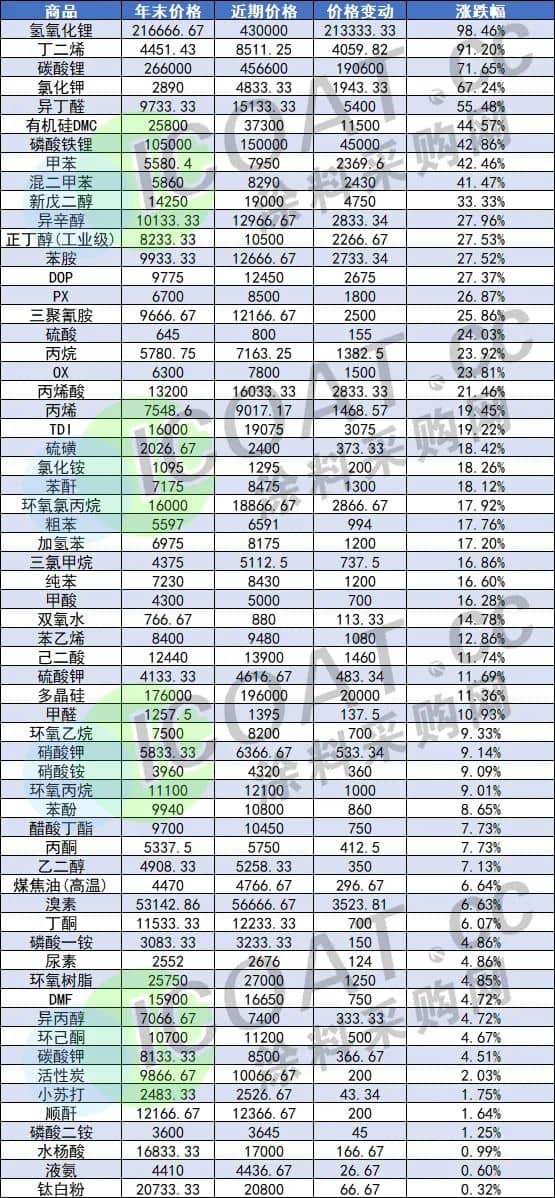 化工龍頭的漲價,不僅給行業(yè)中眾多企業(yè)起到了風(fēng)向標的帶頭引領(lǐng)作用,也預(yù)示著整個行業(yè)未來的方向。回想起來,今年年初開始,漲價的東風(fēng)就從未停歇,多種化工品乘勢而上,似乎在比賽一般,價格呈現(xiàn)突飛猛進之態(tài),氫氧化鋰更是暴漲21萬元/噸,漲幅接近100%翻倍,著實令人難以“招架”。