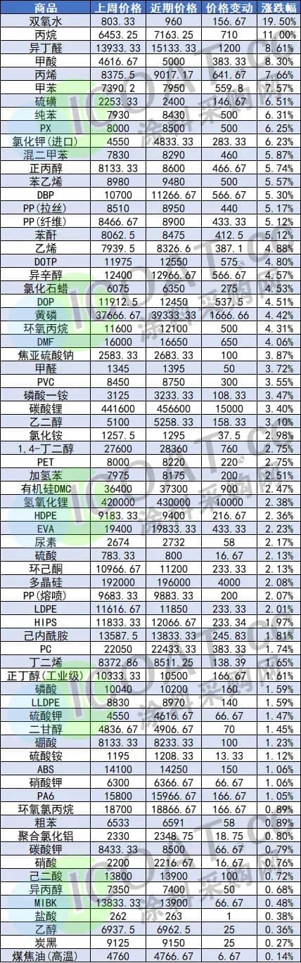 期貨市場的行情火爆持續(xù)良久,對于現(xiàn)貨市場的價格提升也在持續(xù)。近一周以來,20余種化工品價格走高,最高上漲15000元/噸,部分化工品漲幅近20%。