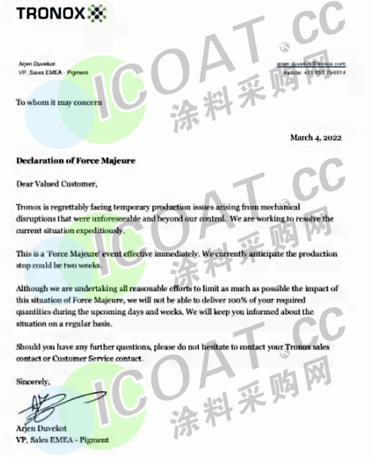 而在此前,以特諾為代表的眾多外資鈦白粉企業曾發布漲價函,宣布4月1日起,產品價格進行調漲。而這張不可抗力的通知的到來無疑讓大家感到措手不及,還沒開始囤貨,就迎來了“斷貨”。