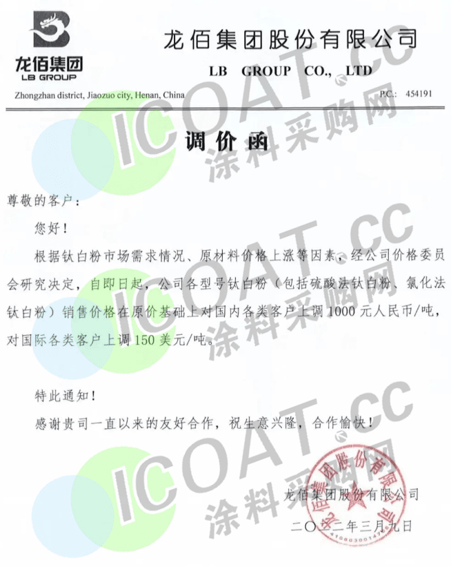 近日,國內(nèi)鈦白粉龍頭企業(yè)龍佰集團(tuán)公告,自即日起各型號(hào)鈦白粉(包括硫酸法鈦白粉、氯化法鈦白粉)銷售價(jià)格在原價(jià)基礎(chǔ)上對(duì)國內(nèi)各類客戶上調(diào)1000元人民幣/噸,對(duì)國際各類客戶上調(diào)150美元/噸。