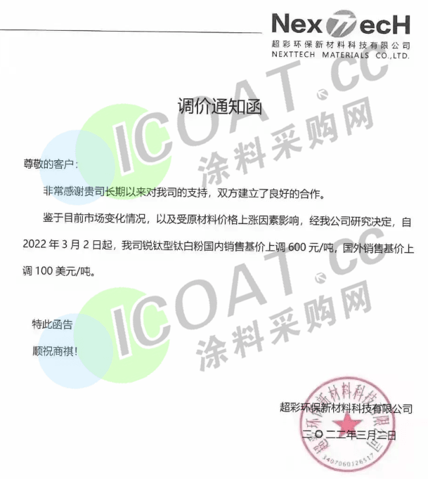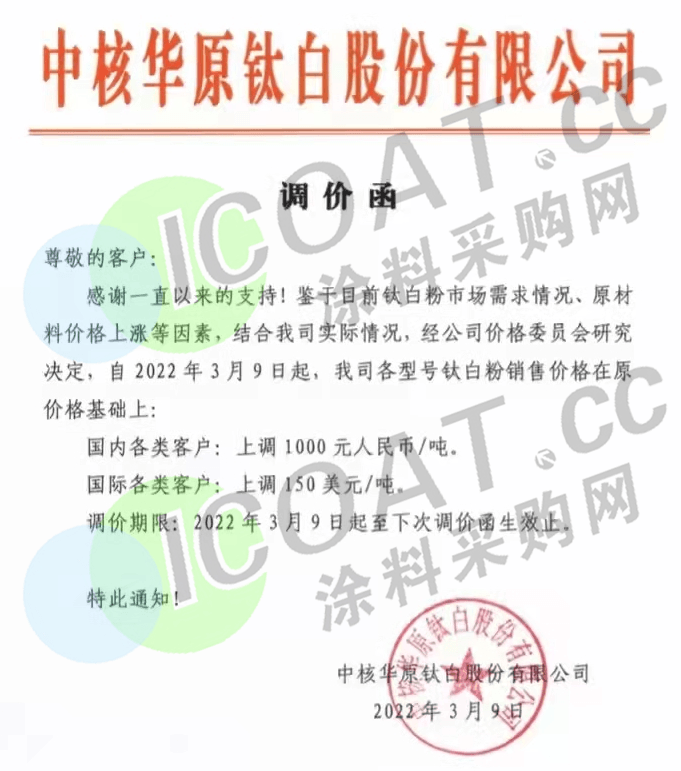 中核華原鈦白:3月9日起,各型號(hào)鈦白粉價(jià)格在原價(jià)基礎(chǔ)上,國內(nèi)各類客戶上調(diào)1000元/噸,國際各類客戶上調(diào)150美元/噸。