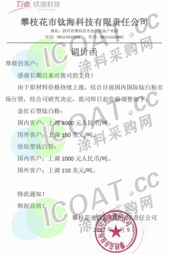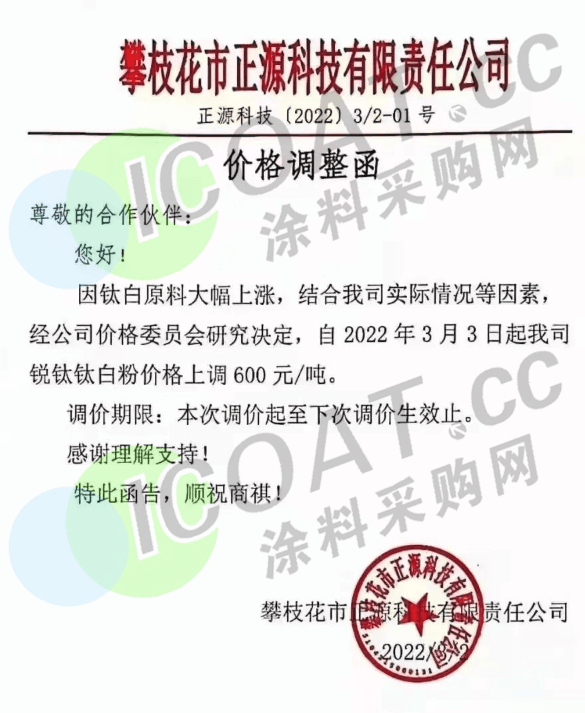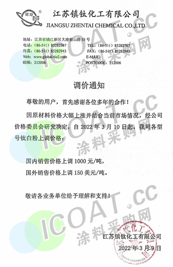 江蘇鎮(zhèn)鈦化工:3月10日起,各型號(hào)鈦白粉上調(diào)價(jià)格:國內(nèi)銷售價(jià)格上調(diào)1000元/噸,國際銷售價(jià)格上調(diào)150美元/噸。