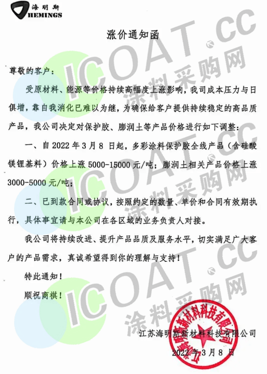 江蘇海明斯新材料:多彩涂料保護(hù)膠全線產(chǎn)品(含硅酸鎂鋰基料)價(jià)格上漲5000-15000元/噸;膨潤土相關(guān)產(chǎn)品價(jià)格上漲3000-5000元/噸。