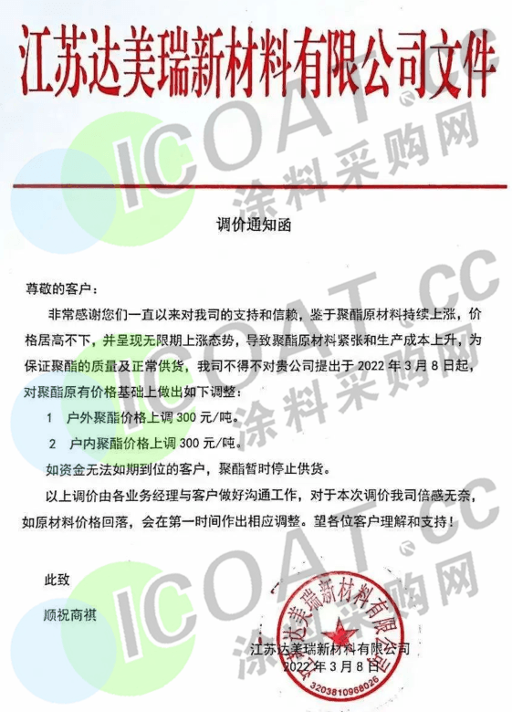 江蘇達(dá)美瑞新材料:戶外聚酯樹脂價(jià)格上調(diào)300元/噸,戶內(nèi)聚酯樹脂價(jià)格上調(diào)300元/噸。