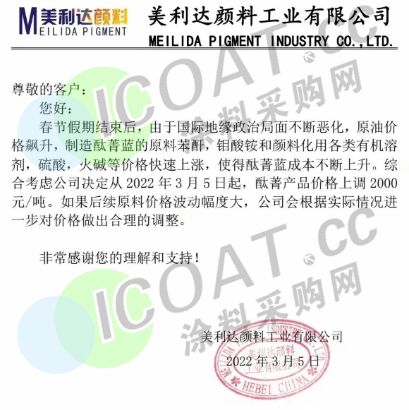 美利達(dá)顏料工業(yè):酞菁產(chǎn)品價(jià)格上調(diào)2000元/噸。