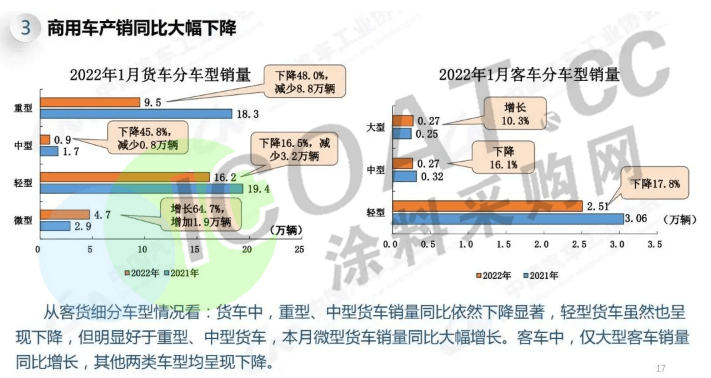 汽車行業(yè)也沒能逃脫厄運(yùn),2022年1月,商用車產(chǎn)銷分別完成34.5萬輛和34.4萬輛,同比分別下降28%和25%。其中,1月重卡銷9.5萬輛,中卡銷0.7萬輛,輕卡銷1.2萬輛,同比分別下降48%、45.8%、16.5%。伴隨著政策紅利逐步消耗殆盡,以及運(yùn)輸市場(chǎng)需求減弱等因素,商用車市場(chǎng)短期內(nèi)難以迅速回暖。