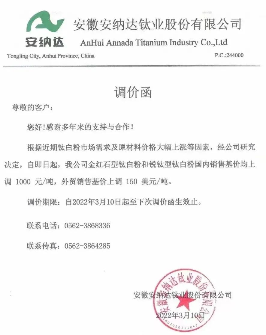 近日,A股鈦白粉龍頭企業(yè)安納達(dá)發(fā)布調(diào)價(jià)函:自即日起,金紅石型鈦白粉和銳鈦型鈦白粉國內(nèi)銷售基價(jià)均上調(diào)1000元/噸,外貿(mào)銷售基價(jià)上調(diào)150美元/噸。