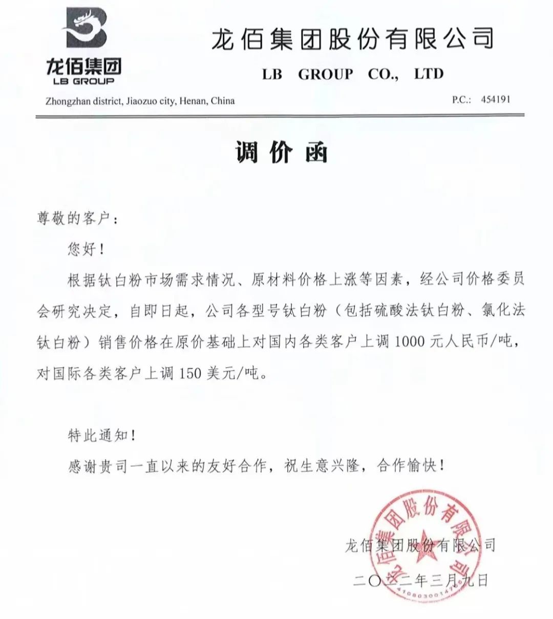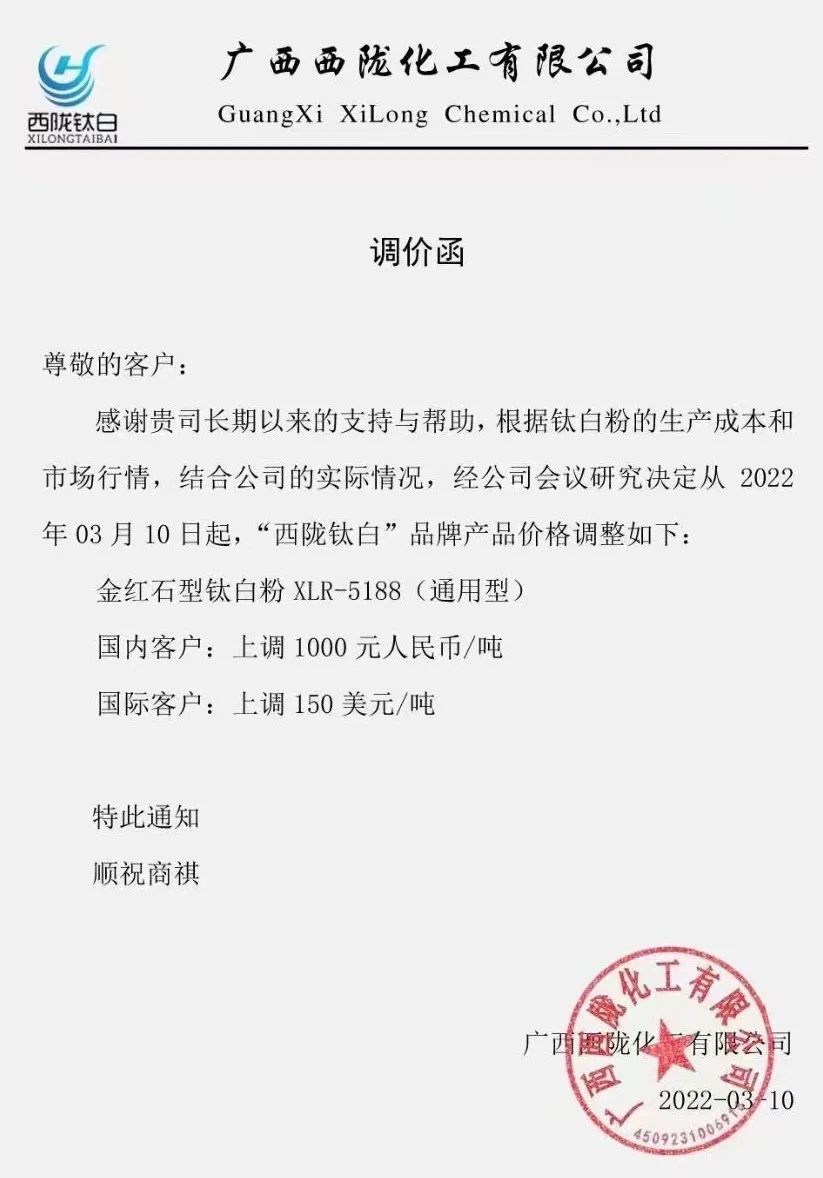 龍佰集團(tuán):自即日起,各型號(hào)鈦白粉(包括硫酸法鈦白粉、氯化法鈦白粉)銷售價(jià)格在原價(jià)基礎(chǔ)上對(duì)國內(nèi)各類客戶上調(diào)1000元/噸,對(duì)國際各類客戶上調(diào)150美元/噸。