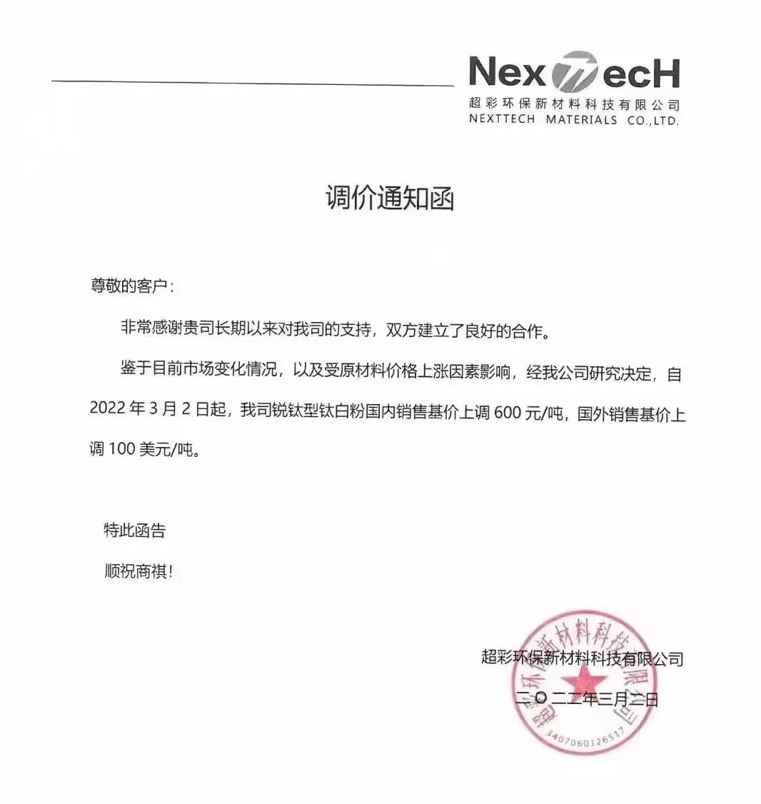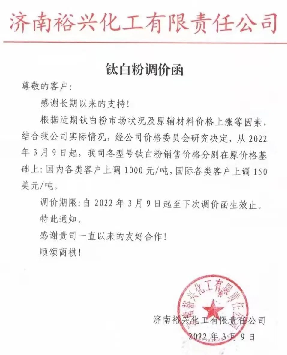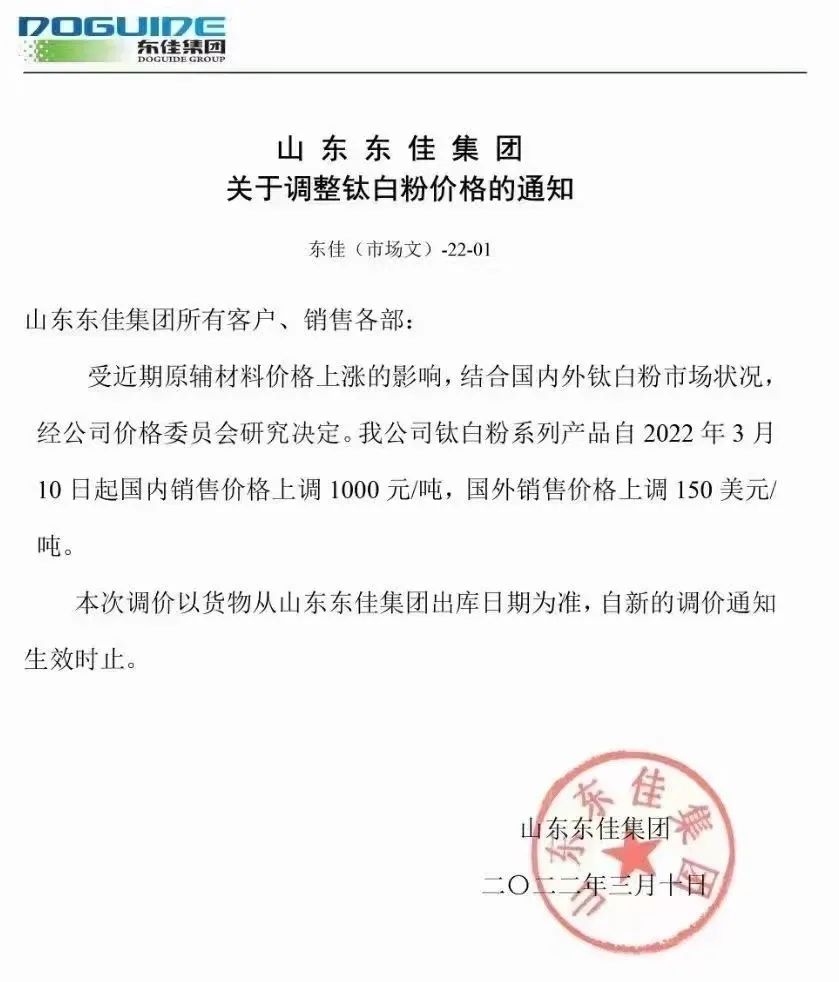 山東東佳集團(tuán):鈦白粉系列產(chǎn)品自2022年3月10日起國內(nèi)銷售價(jià)格上調(diào)1000元/噸,國外銷售價(jià)格上調(diào)150美元/噸。