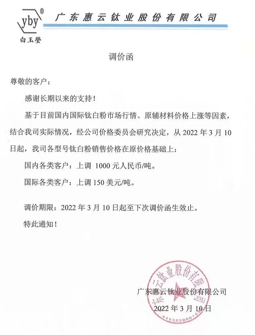 廣東惠云鈦業(yè):3月10日起,各型號(hào)鈦白粉銷售價(jià)格在原價(jià)格基礎(chǔ)上:國內(nèi)各類客戶上調(diào)1000元/噸,國際各類客戶上調(diào):150美元/噸。