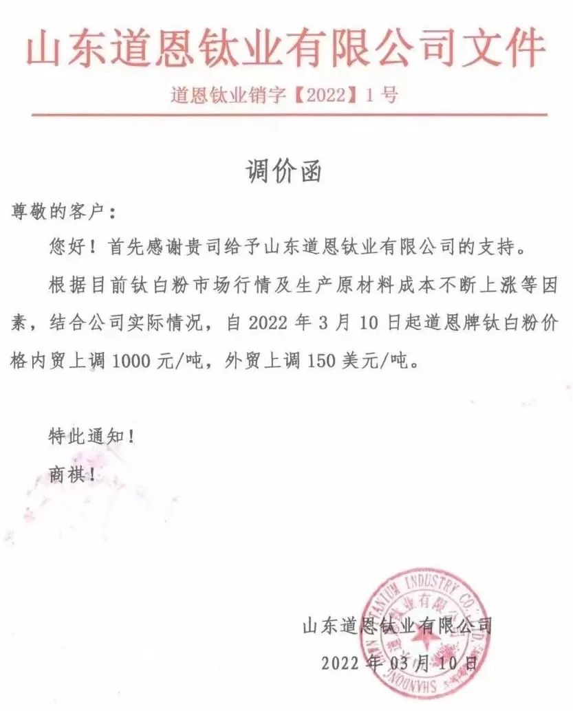山東道恩鈦業(yè):自2022年3月10日起道恩牌鈦白粉價(jià)格內(nèi)貿(mào)上調(diào)1000元/噸,外貿(mào)上調(diào)150美元/噸。