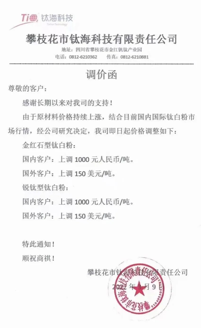 攀枝花市鈦海科技:即日起金紅石/銳鈦型鈦白粉國內(nèi)客戶上調(diào)1000元/噸,國外客戶上調(diào):150美元/噸。