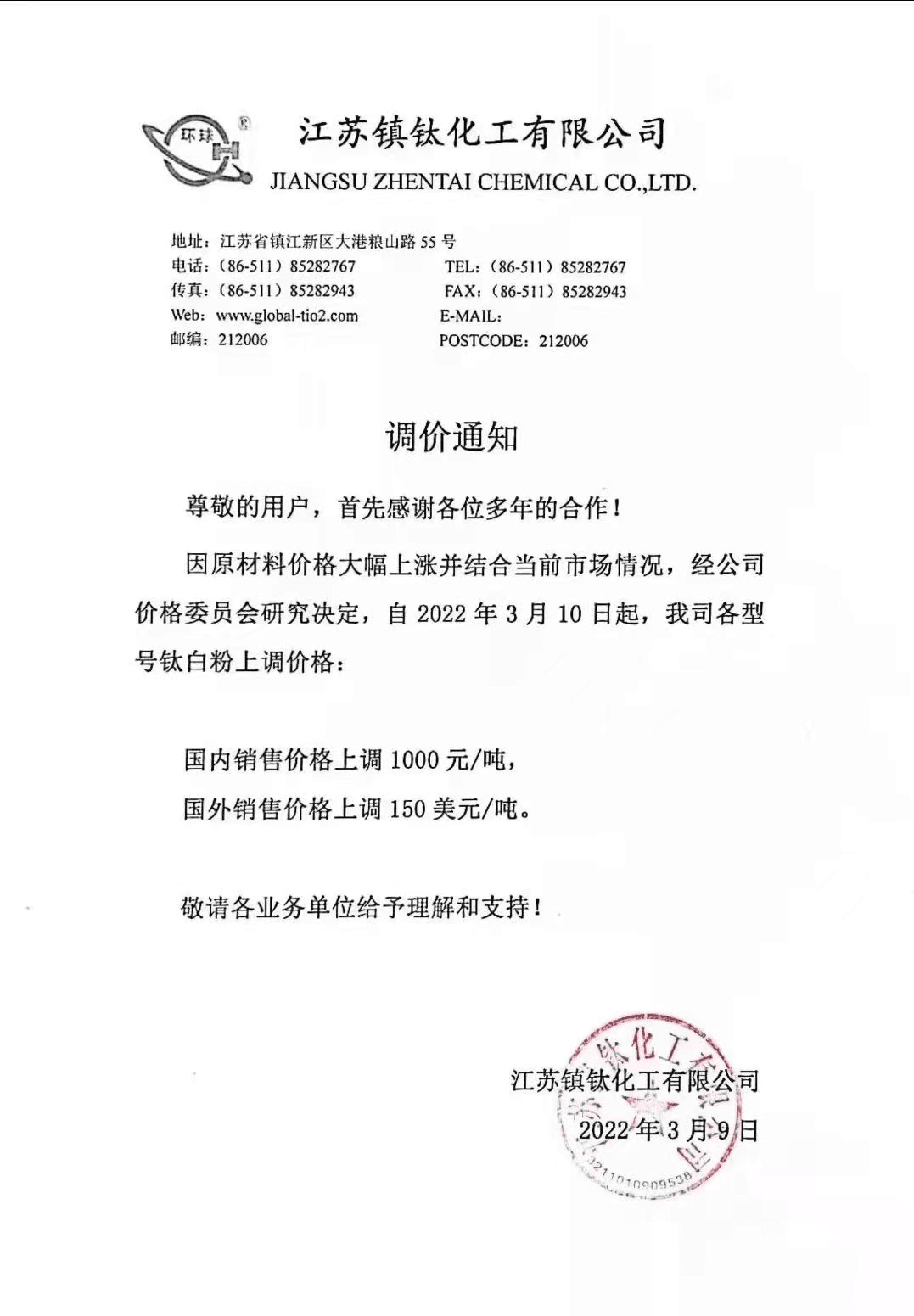 江蘇鎮(zhèn)鈦:3月10日起,各型號(hào)鈦白粉上調(diào)價(jià)格:國內(nèi)銷售價(jià)格上調(diào)1000元/噸,國外銷售價(jià)格上調(diào)150美元/噸。