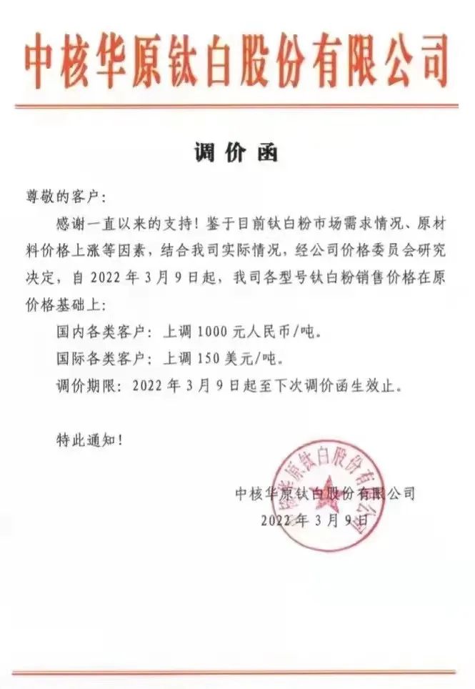 中核華原鈦白:即日起各型號(hào)鈦白粉在原價(jià)格基礎(chǔ)上:國內(nèi)各類客戶上調(diào)1000元/噸,國外各類客戶上調(diào)150美元/噸。