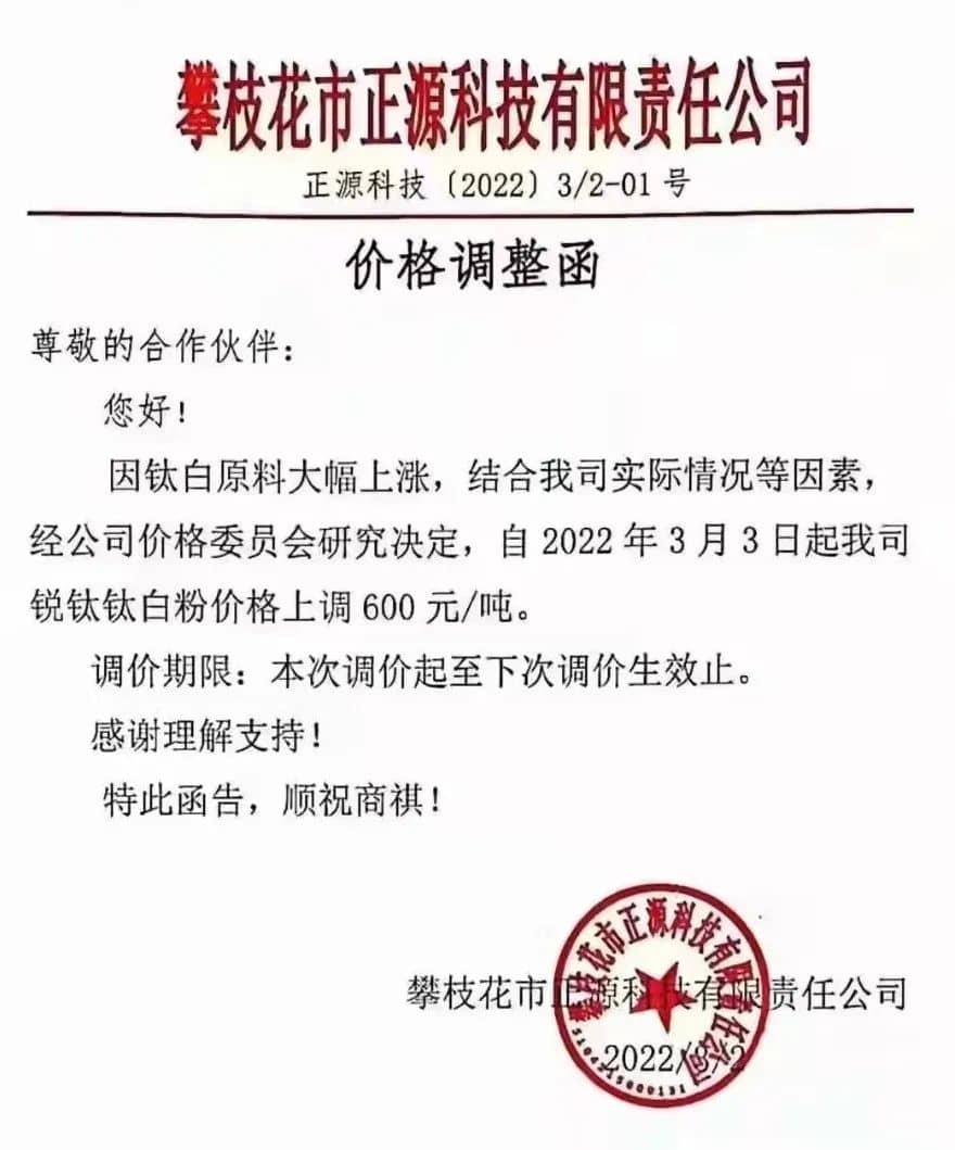 攀枝花正源科技:銳鈦型鈦白粉價(jià)格上調(diào)600元/噸。