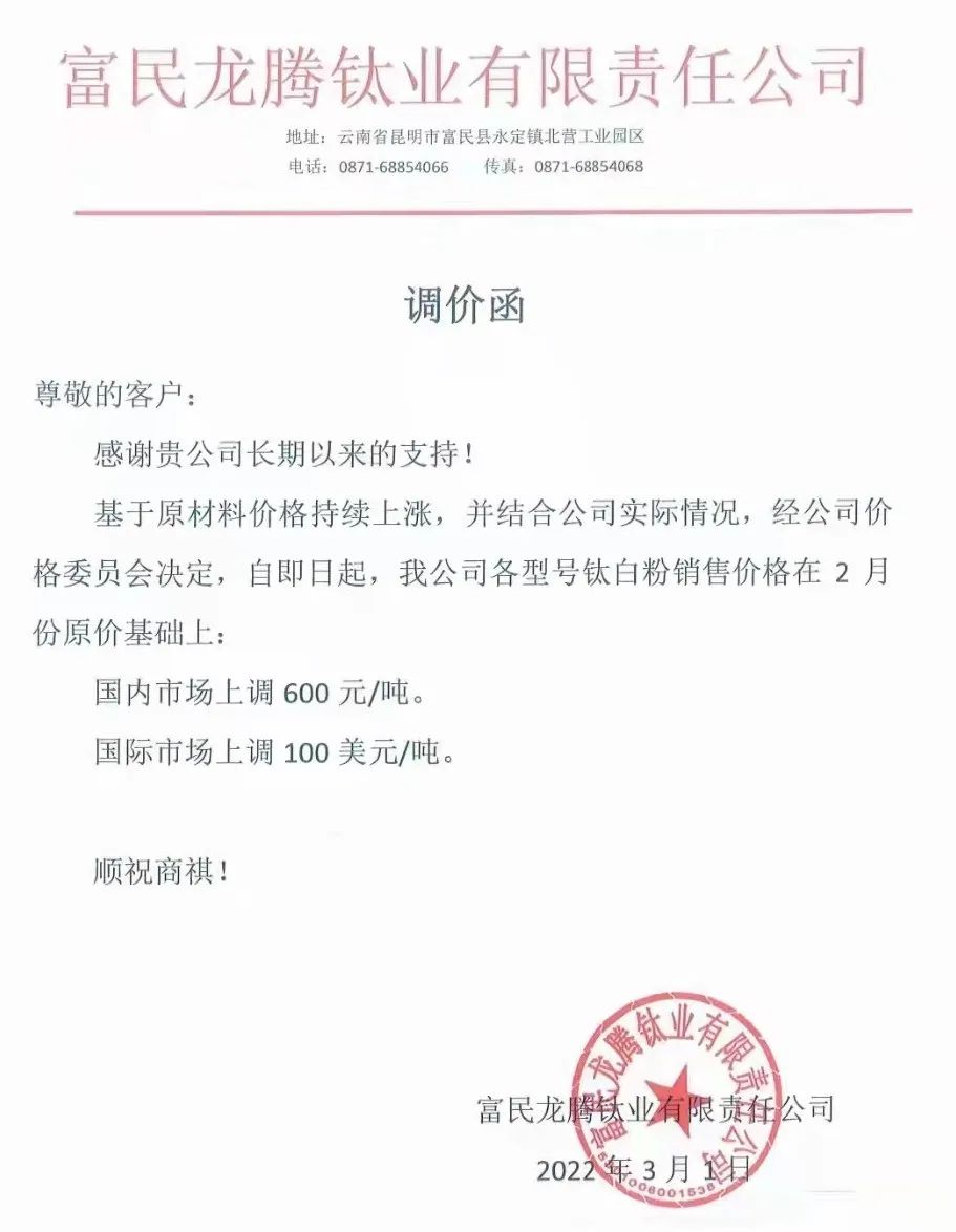 富民龍騰鈦業(yè):即日起,各型號(hào)鈦白粉銷售價(jià)格在2月份基礎(chǔ)上,國內(nèi)市場(chǎng)上調(diào)600元/噸,國際市場(chǎng)上調(diào)100美元/噸。
