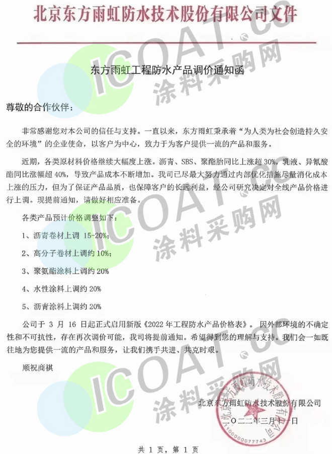 明確表示,將于3月16日起正式啟用新版《2022年工程防水產品價格表》,因外部環境的不確定性和不可抗性,存在再次調價可能。