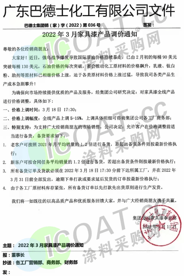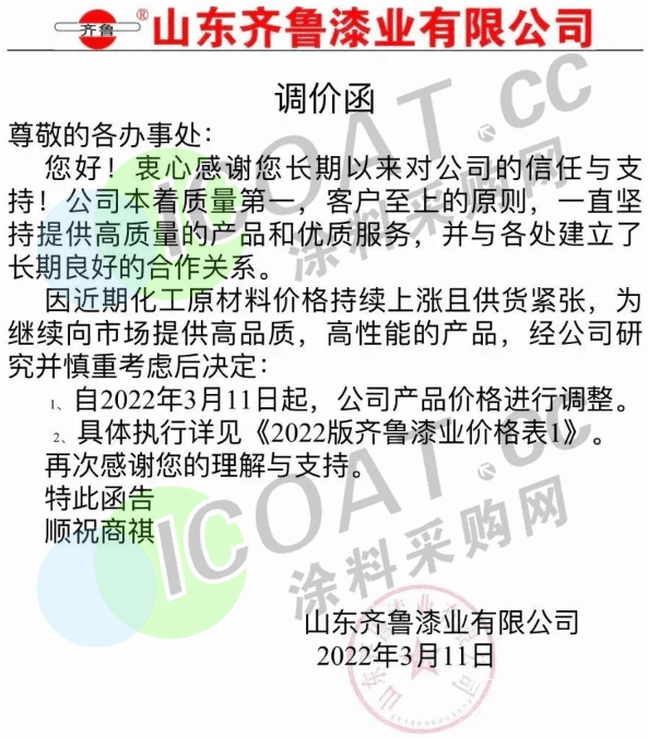 山東奔騰漆業:3月11日下午17:00時起所接訂單執行新價格,原價格表自行廢止,價格優惠政策全部取消。調價幅度以調整后的新價格表為執行標準。