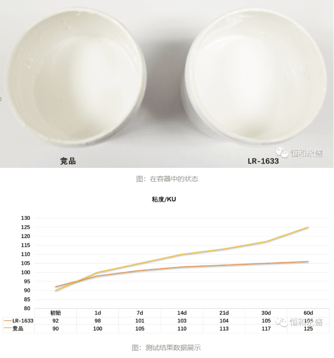 實(shí)驗(yàn)結(jié)果:兩者在容器中的狀態(tài)均無(wú)異常,兩者在50℃烘箱熱貯60天,競(jìng)品的粘度變化更大,故采用LR-1633無(wú)機(jī)硅酸鹽乳液貯存穩(wěn)定性方面有著更好的表現(xiàn)。