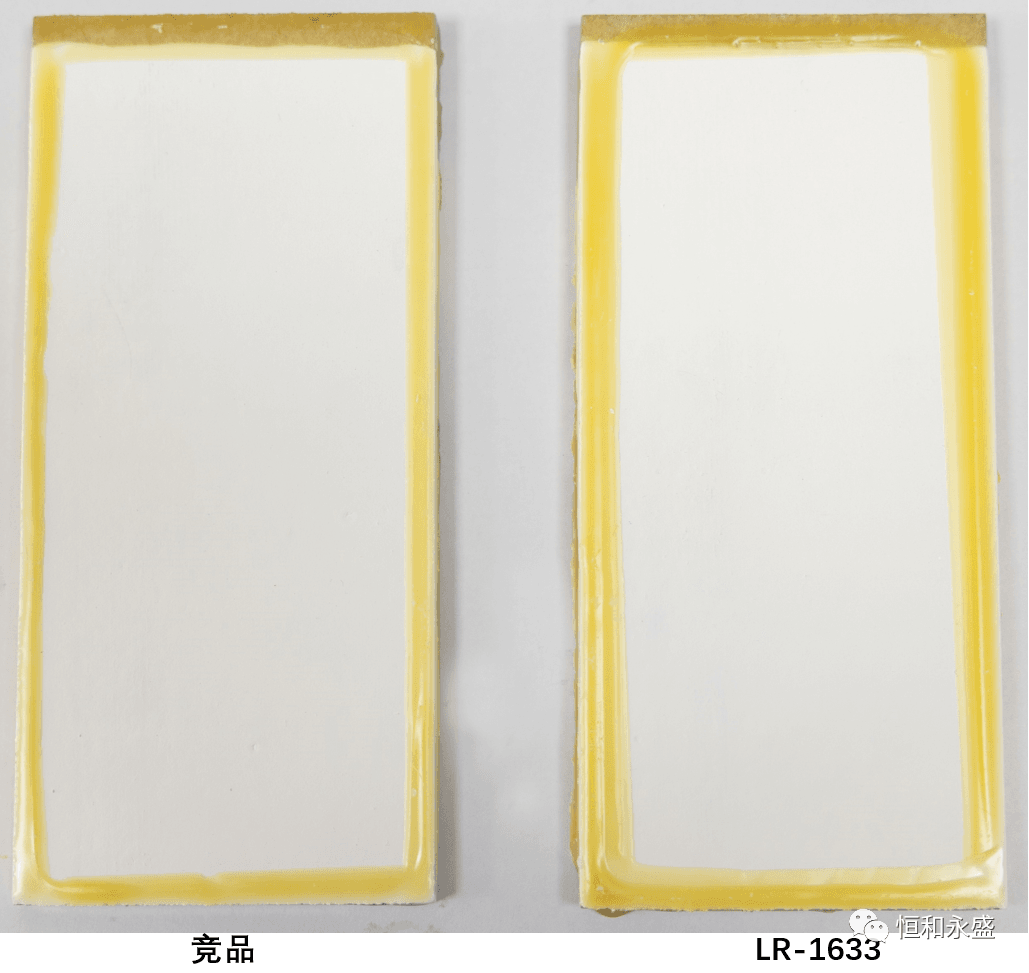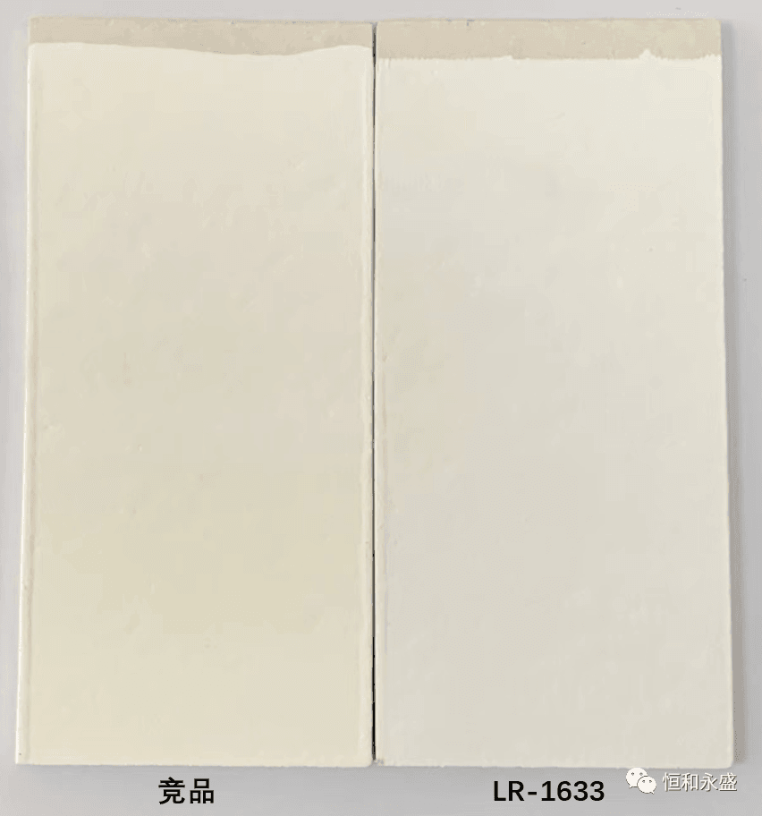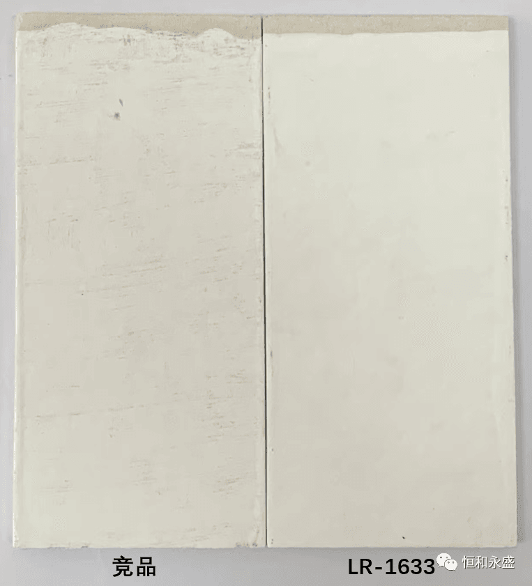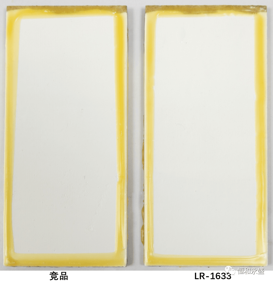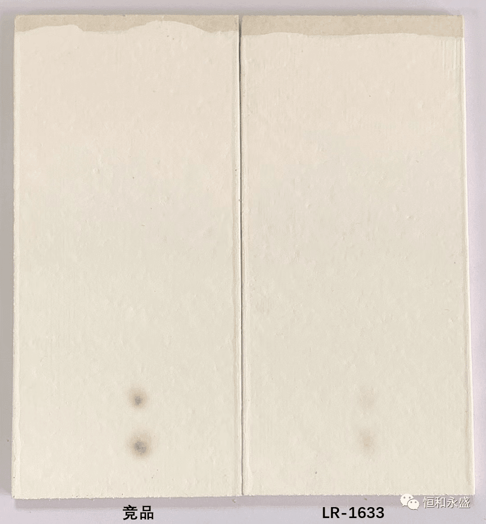實(shí)驗(yàn)結(jié)果:LR-1633泡水未出現(xiàn)起泡、掉粉、明顯變色等涂膜病態(tài)現(xiàn)象,而競(jìng)品有掉粉現(xiàn)象,可見(jiàn)LR-1633的耐水性更佳。