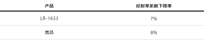 實(shí)驗(yàn)結(jié)果:兩次循環(huán)試驗(yàn)后觀察測(cè)試板,結(jié)果競(jìng)品試板比LR-1633試板稍臟;測(cè)試兩者反射率,競(jìng)品反射率系數(shù)下降率比LR-1633的稍大,所以LR-1633耐沾污性優(yōu)于競(jìng)品。