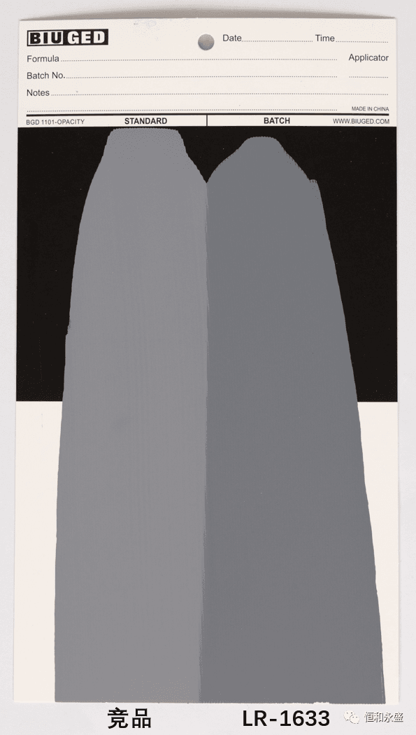 實(shí)驗(yàn)結(jié)果:通過(guò)LR-1633紙卡展色對(duì)比以及LR-1633水泥板展色對(duì)比可以看出,LR-1633展色明顯優(yōu)于競(jìng)品。