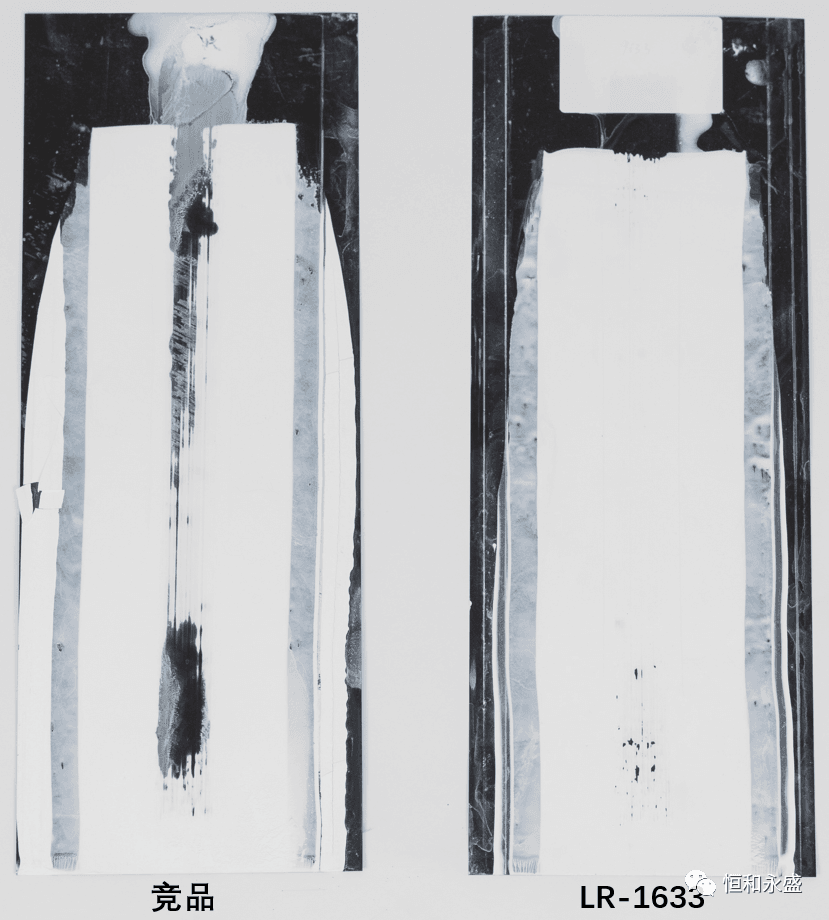 實(shí)驗(yàn)結(jié)果:耐堿性表現(xiàn)上,競(jìng)品有粉化現(xiàn)象,LR-1633無(wú)異常反應(yīng),故LR-1633耐堿性比競(jìng)品佳。