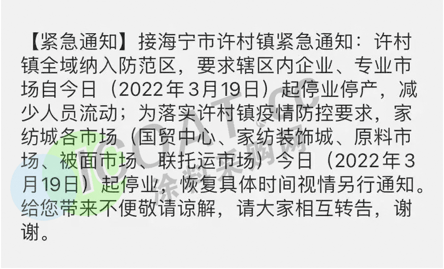 紡織重鎮海寧告急,國貿中心、家紡輕紡城、原料市場、被面市場等19日起暫停營業,工廠生產、銷售推廣、物流配送等均受到了影響,對化工人又是一次不小的打擊。
