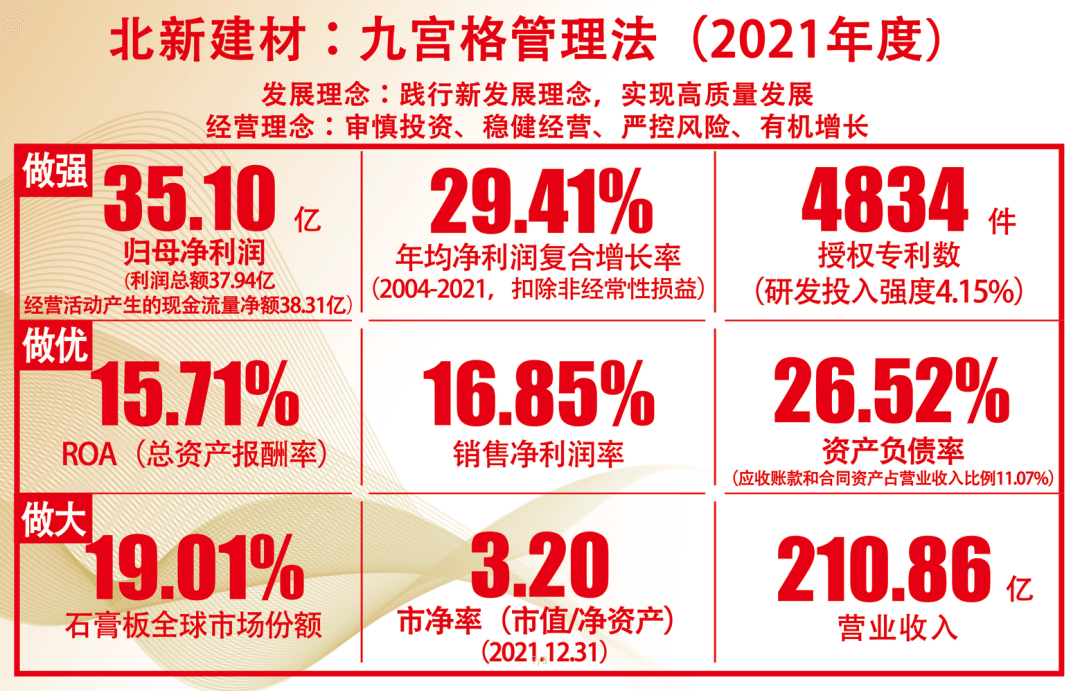 十八年來,北新建材實現年均凈利潤復合增長率近30%(扣除非經常性損益),經營業績和經營質量各項指標高質量發展,創造了制造業穿越周期實現可持續高質量增長的奇跡。北新建材戰略、經營、管理、創新、業績、黨建實現全方位跨越式發展和本質性飛躍。2004年從北京一家石膏板廠兩條生產線起步,實施聚焦戰略和制高點戰略,通過全國布局和聯合重組,3年躍居中國第一、5年躍居亞洲第一,8年躍居世界第一;2019年制定“一體兩翼、全球布局”發展戰略,目前已投產、擴產和簽約石膏板業務規模達38.38億平方米,繼續保持全球最大石膏板產業集團領先地位,在一個充分競爭、完全開放的制造業贏得全國60%、全球19%的市場份額;輕鋼龍骨業務規模達48.8萬噸,躍居全球最大輕鋼龍骨產業集團;進軍防水材料三年時間,躍居全國前三;組建中國涂料復興聯盟,贏得行業協會和行業主要企業廣泛支持;完成五大海外石膏板生產基地布局,亞非歐第一階段全球化布局順利落地。
