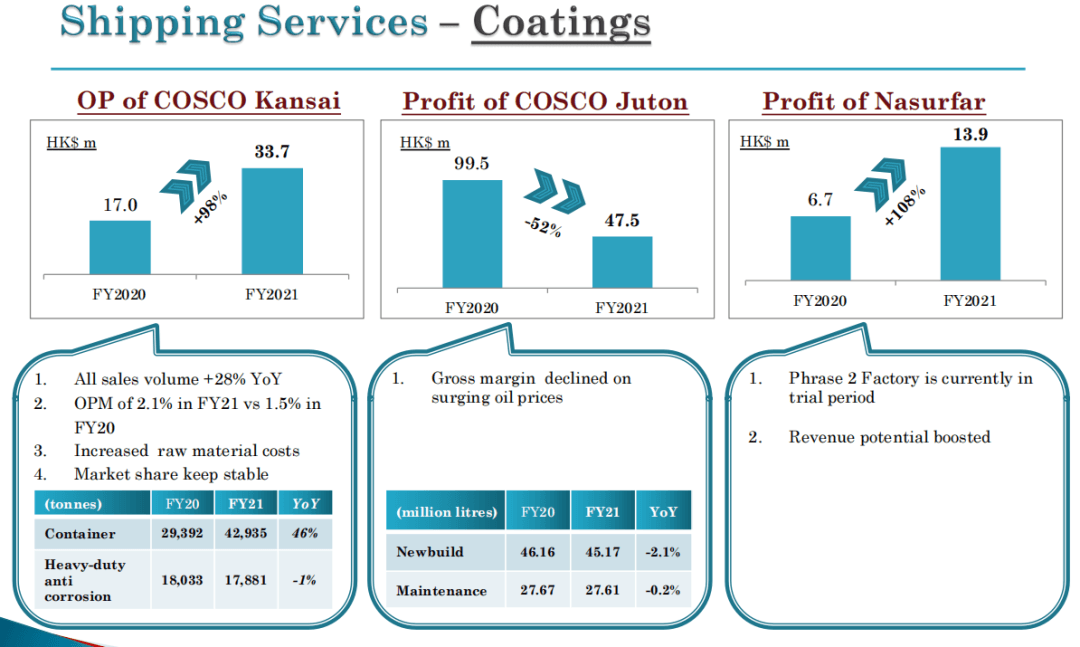 近日,中遠海運國際公布2021年度財務業績報告。去年銷售收入45.335億港元,同比增長32%,主要由于涂料、船舶設備及備件以及一般貿易的分部收入均同比上升。毛利潤同比增長22%至7.694億港元。但是,毛利率下跌至17%,主要受涂料分部毛利率下跌所帶動。2021年實現凈利潤為3.036億港元,上一年為3.475億港元。