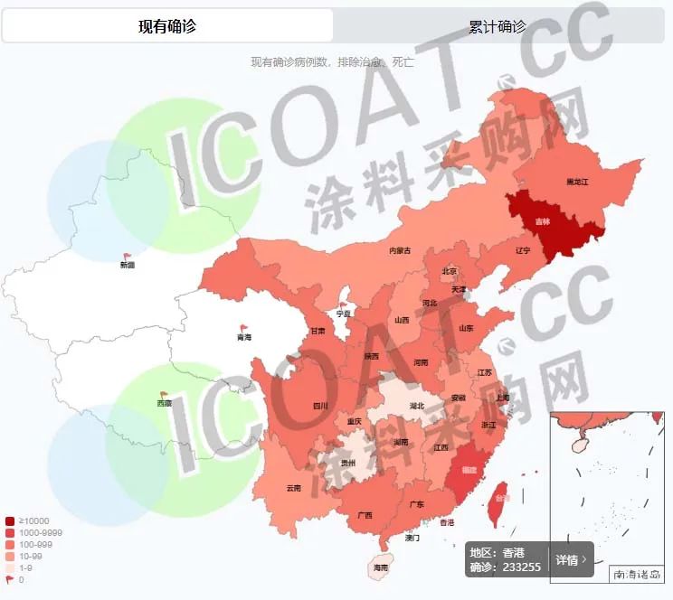截至目前,香港累計(jì)確診285122例,湖北累計(jì)確診68391例,吉林累計(jì)確診27723例,臺(tái)灣累計(jì)確診22992例,以上城市累計(jì)確診均超過(guò)萬(wàn)例。廣東累計(jì)確診6572例,上海累計(jì)確診5729例,陜西累計(jì)確診3221例,河南累計(jì)確診2814例,另有多個(gè)城市累計(jì)確診超過(guò)千例。