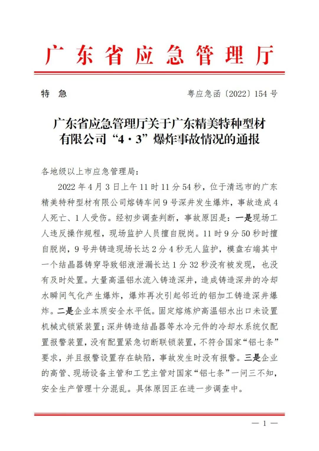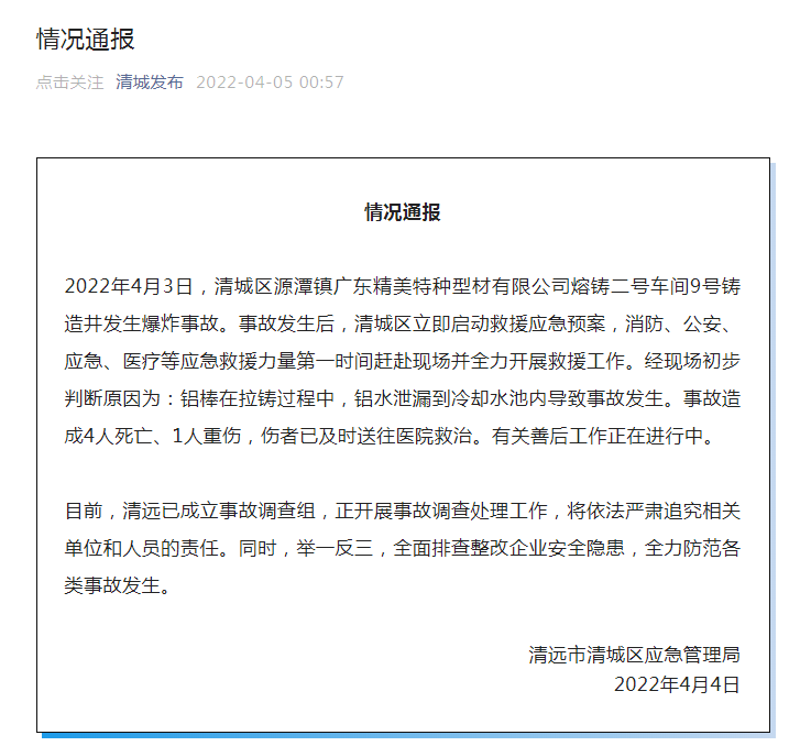 通報稱,2022年4月3日,清城區(qū)源潭鎮(zhèn)廣東精美特種型材有限公司熔鑄二號車間9號鑄造井發(fā)生爆炸事故。事故發(fā)生后,清城區(qū)立即啟動救援應急預案,消防、公安、應急、醫(yī)療等應急救援力量第一時間趕赴現(xiàn)場并全力開展救援工作。經現(xiàn)場初步判斷原因為:鋁棒在拉鑄過程中,鋁水泄漏到冷卻水池內導致事故發(fā)生。事故造成4人死亡、1人重傷,傷者已及時送往醫(yī)院救治。有關善后工作正在進行中。