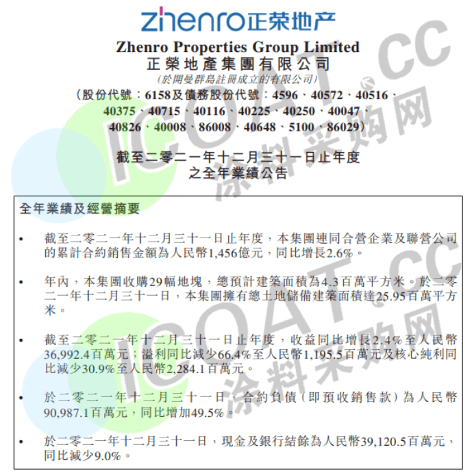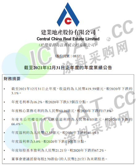 建業地產:全年合約銷售額為601.05億元,同比2020年減少約12%;建業地產收益約為419.59億元,同比下跌3.1%,物業銷售收益由2020年約416.07億元減少2.2%至2021年約407.09億元;毛利約為68.11億元,同比減少20.8%;毛利率約16.2%,同比下跌3.7%;凈利潤約12.53億元,同比減少40.4%。