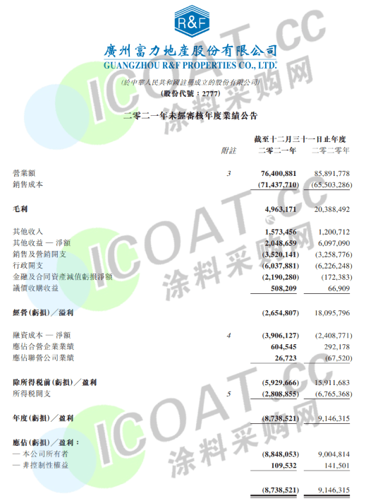 富力地產:2021年富力地產實現收入764億元(人民幣,下同),同比減少11.05%,包括按平均售價每平方米8300元入賬建筑面積831萬平方米;毛利49.63億元,同比減少75.66%,歸屬股東凈虧損88.48億元。富力地產合約銷售總額為1202億元,銷售總建筑面積941萬平方米。新增土地資本開支總額僅為30億元,較2020年減少80%。