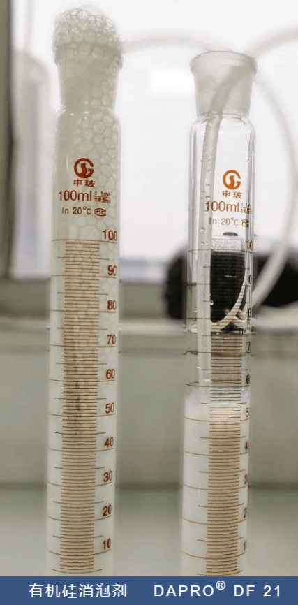 鼓泡測試的結(jié)果(如下圖),同樣可以看出,使用有機硅消泡劑的試樣,氣泡很快就充滿量筒,而使用DAPRO®DF 21的試樣,鼓泡1個小時,還具有優(yōu)異的抑泡性能: