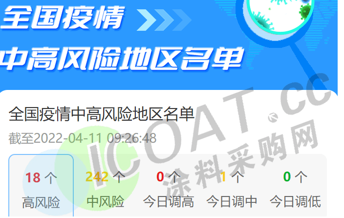 據涂料采購網了解,3月以來的這波疫情已蔓延至29省市,單日新增本土感染已連續6天超過2萬例,吉林省本土新增187+797例,上海本土新增914+25173,累計報告本土感染者超20萬例。截至4月11日9時,我國除港澳臺外,其他31個省(自治區、直轄市)和新疆生產建設兵團,高風險區18個,中風險區242個,疫情嚴峻程度不言而喻。