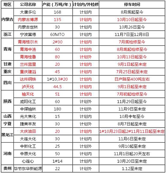 每周國內主要甲醇裝置檢修實況一覽表
