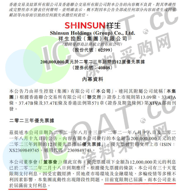 近日,房地產先行者祥生控股集團發布公告稱,2023年優先票據加速通知已觸發公司2022年到期2億美元10.5厘優先票據契約項下的交叉違約。并應公司要求,2022年優先票據將于2022年4月6日上午9時正起于聯交所暫停買賣,直至另行通知為止。