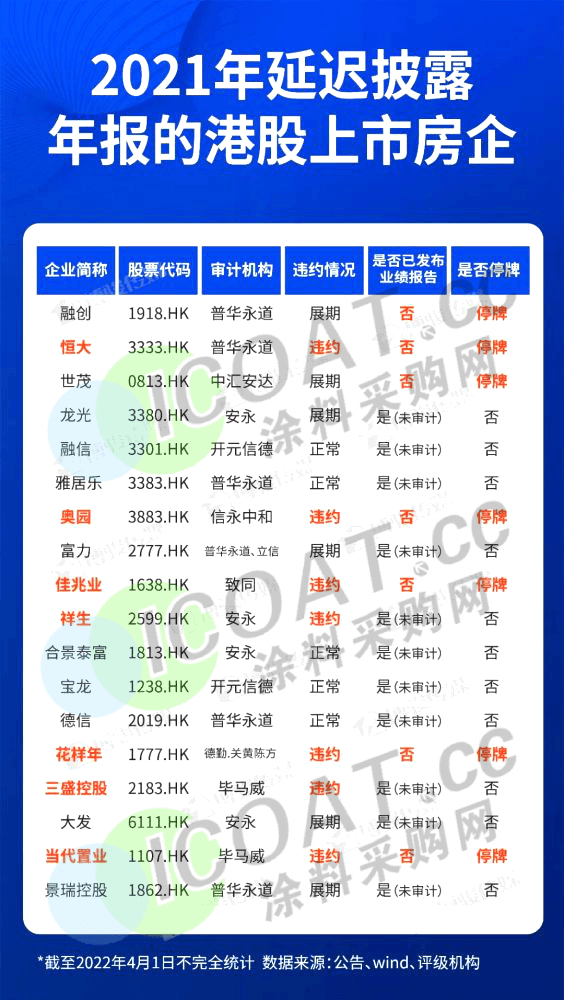 按照港交所的上市規則,在港上市的房企,年報延遲披露會帶來停牌的風險。事實上,花樣年集團、當代置業、陽光100中國等16家在港交所上市內地房企已于4月1日被港交所停牌,停牌原因指向年報延期。專業人士透露,年報延遲披露的背后或是利潤不及預期,或是民營房企的財務危機,而并非房企所稱的疫情等原因。
