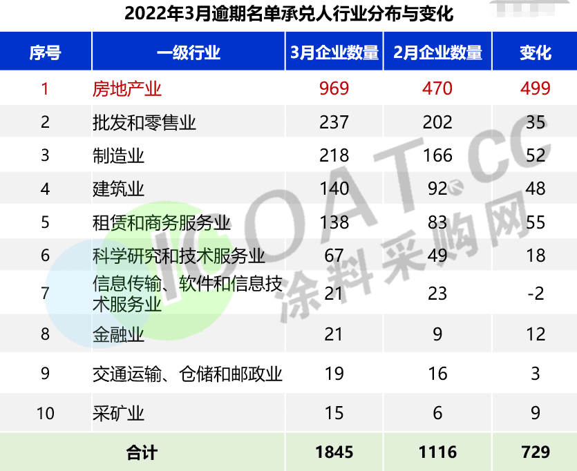 上海票據交易所公布了截至2022年3月31日的商票持續逾期名單,名單上企業合計1904家,較上月末增加756家。房地產相關企業依然是重災區,逾期承兌共969家企業,在逾期企業中占比51%,較2月數量增加499家,在新增逾期企業中占比高達66%,毫無意外的登上了榜首。此外,建筑業、租賃和商務服務業兩個房地產相關行業商票逾期企業數量也保持高增長。