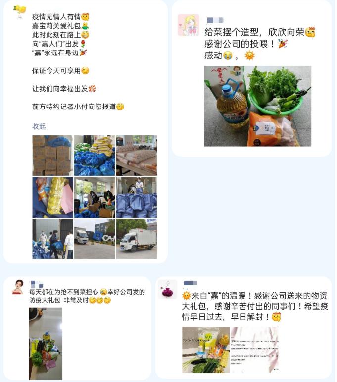 關愛大禮包在上海各區穿梭,送到了在封閉小區的員工手上,讓他們感受到“嘉”的速度與溫暖。許多“嘉”人刷屏寫下感言。