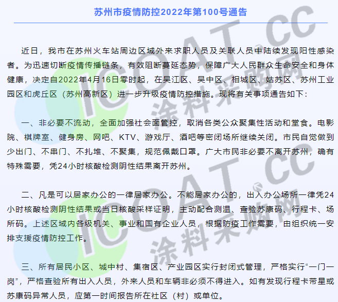 近日,江蘇蘇州發布《蘇州市疫情防控2022年第100號通告》,稱為迅速切斷疫情傳播鏈條,有效阻斷蔓延態勢,保障廣大人民群眾生命安全和身體健康,決定自2022年4月16日零時起,在吳江區、吳中區、相城區、姑蘇區、蘇州工業園區和虎丘區(蘇州高新區)進一步升級疫情防控措施。