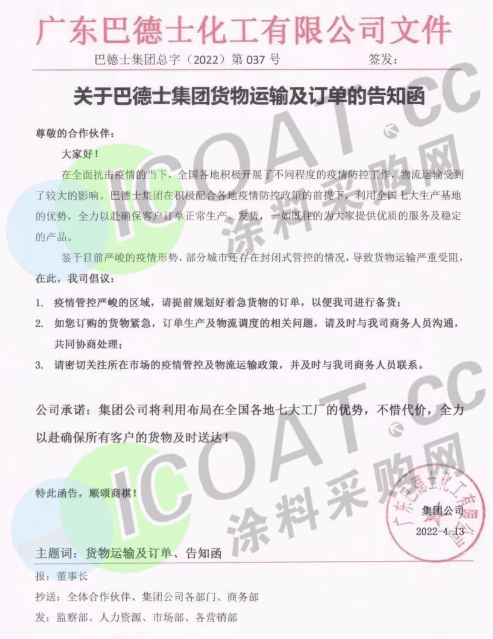 巴德士集團緊急發布《關于巴德士集團貨物運輸及訂單的告知函》,稱在全面抗擊疫情的當下,全國各地積極開展了不同程度的疫情防控工作,物流運輸受到了較大的影響。